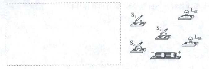 17. 某保密室有三道门,关上一道门相当于闭合一个开关.只要有一道门没有关上,红色和绿色的指示灯都会发光.当三道门都关上时,红灯会熄灭,只有绿灯会发光.请设计出符合要求的电路图画在虚线框内,并根据所设计的电路图