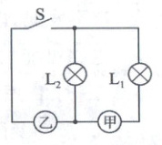 7. 在如图所示的电路中,若在闭合开关 $ S $ 后,两只灯泡都能发光,应在甲、乙两处连入的元件是(