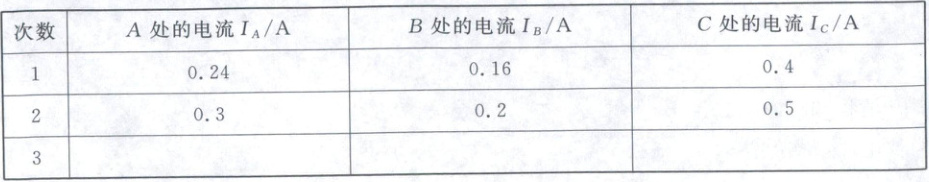 (3)第三次实验电流表在 $ A $、$ B $、$ C $ 处的电流如图所示,请填入表中: