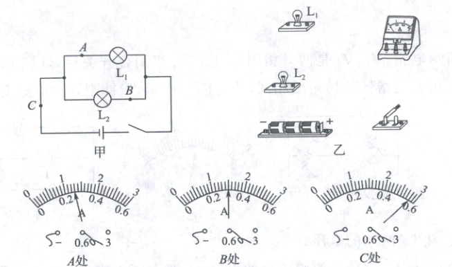 (1)小丽同学进行探究实验的电路如图甲所示,请你用笔画线代替导线,在图乙中连接测量 $ A $ 点电流时的实物电路图(电流表用小量程).