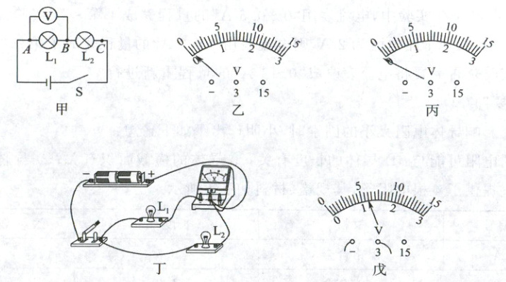 (6)改正电路后,闭合开关.如图戊所示,电压表的示数为______ $ V $;若电源电压为 $ 3 \, V $,则灯 $ L_1 $ 两端的电压是______ $ V $.
