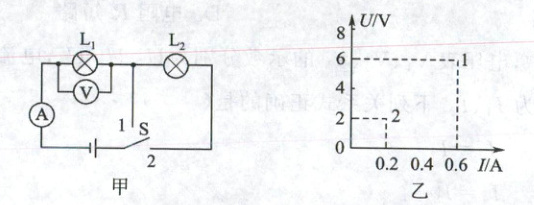 17. 如图甲所示,当开关 $S$ 由接点 $1$ 转到接点 $2$ 时,电压表示数变化如图乙所示,则灯泡 $L_{2}$ 两端的电压是______$V$,通过灯泡 $L_{2}$ 的电流是______$A$,电源电压是______$V$.若开关 $S$ 在 $2$ 处,灯 $L_{2}$ 断路,则电压表的示数为______$V$.