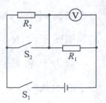 4. 如图所示,$ R_{1}= 10\Omega $,当 $ S_{1} $、$ S_{2} $ 均闭合时,电压表示数为 $ 6V $;当 $ S_{1} $ 闭合,$ S_{2} $ 断开时,电压表示数为 $ 4V $。电源电压 $ U $ 和电阻 $ R_{2} $ 的大小分别是(