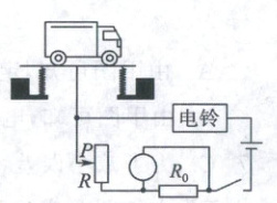 3. 某科技小组设计了一个地磅,地磅内部简化电路如图。其工作原理是车辆开上地磅会压缩弹簧(弹簧处于弹性限度内)引起滑片 $ P $ 移动,当电路的电流 $ I\geqslant I_{0} $($ I_{0} $ 为某一定值)时,电路中电铃会发出警示声(电铃可视为一个小电阻),表明车辆超重了。圆圈处是电压表可反映车辆的重量,$ R_{0} $ 为保护电阻,电源电压不变。下列说法正确的是(