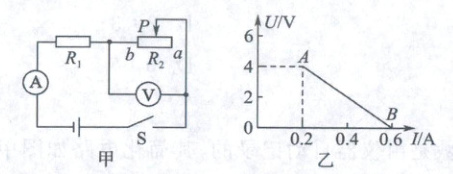 5. 如图甲所示,电源电压保持不变,$ R_{1}= 10\Omega $。闭合开关 $ S $,滑动变阻器滑片 $ P $ 从 $ a $ 端移到 $ b $ 端,两电表示数变化关系如图乙所示,则电源电压和滑动变阻器的最大阻值分别为(
