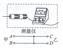 6. 甲、乙两地相距 $ 30km $,在甲、乙两地之间沿直线架设了两条输电线,已知输电线的电阻与长度成正比。现输电线在某处发生了短路,为确定短路位置,甲地检修员先用如图所示的测量仪接入 $ AB $ 时,电流表的示数为 $ 0.2A $,乙地检修员后用相同的测量仪接入 $ CD $ 时,电流表的示数为 $ 0.3A $。则短路位置离甲地(