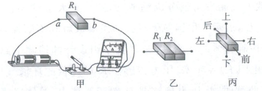 17. 如图所示,$ R_{1} $ 是一块合金导体,将其按照图甲的方式连入电路中,闭合开关,电流表的示数为 $ I $,将另一块相同的导体 $ R_{2} $ 与 $ R_{1} $ 按照乙图方式接入电路,闭合开关,此时电流表的示数 ______(选填“大于”“小于”或“等于”)$ I $。将导体 $ R_{1} $ 按照丙图中不同的方式连入电路,电流表示数最小的接法是 ______(选填“前后”“左右”或“上下”)。