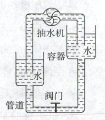 12. 类比是研究物理问题的常用方法.如图所示,两容器中的水在抽水机的作用下不断从低处抽运到高处,从而在管道中形成了水流.可以将电路中形成电流的情境与上述情境作类比.下列类比合理的是(