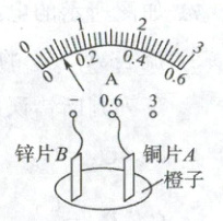 11. 小云将铜片A和锌片B插入橙子中,就制成了一个水果电池.他用导线将电流表的两个接线柱分别连在铜片A和锌片B上,观察到电流表指针发生了偏转,如图所示.关于该电路,说法正确的是(
