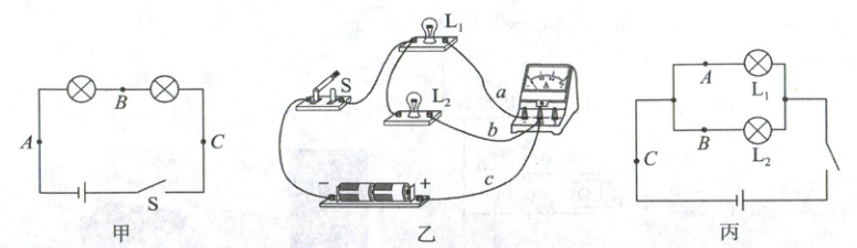 (3) 如图丙所示,小明同学在探究“并联电路中电流的特点”时,分别测出了A、B、C处的电流I_A、I_B、I_C并记录下数据如表所示,接下来应该采取的操作是