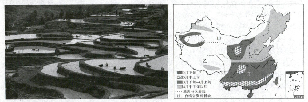 谚语是劳动人民智慧的结晶,多数反映了劳动人民的生活实践经验。《绿水青山看中国》节目中的谚语“山北黄牛下地,山南水牛犁田”,是对我国某地区农业耕作方式的真实描绘。我国幅员辽阔,各地春耕时间不同。下图为我国春耕时间分布示意图及某区域春耕景象。读图,完成11-13题。