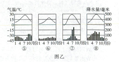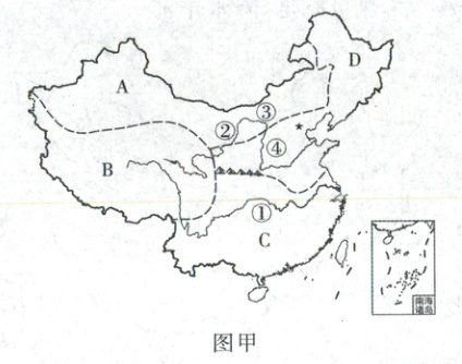 (3)山东省属于四大地理区域中的______区域(填字母),属于乙图中的______气候类型(填序号)。四大地理区域A、B、C、D中,其突出自然特征为高寒的是______(填字母)。