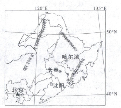 我国东北地区包括黑龙江、吉林、辽宁三省和内蒙古自治区东部。右图为东北地区略图。据此完成9—10题。