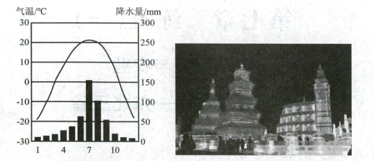 2024年元旦前后,哈尔滨冰雪旅游火爆,带动了周边更多城市和景区火起来。春节期间,烟台的小明随家人也到东北地区享受了一场冰雪盛宴。结合哈尔滨气候统计图,完成15—17题。