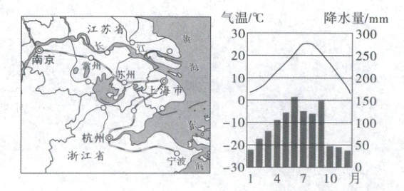 材料二 下面为长江三角洲地区的城市分布示意图和上海多年平均各月气温曲线和降水量柱状图。