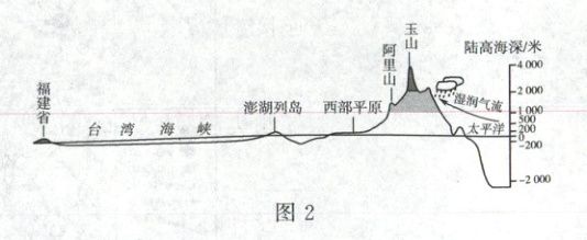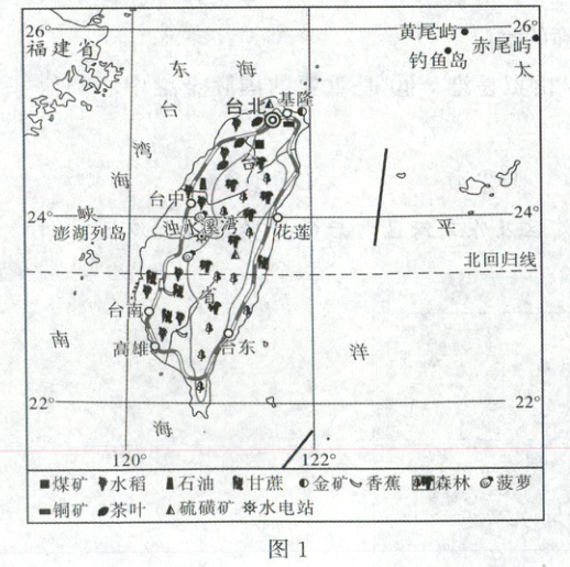 台湾是我国的神圣领土,是祖国不可分割的重要部分。图1为台湾资源分布图,图2为沿北回归线所作的台湾岛地形剖面图。读图,完成10—12题。