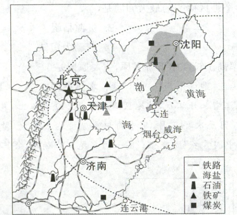 下图为环渤海地区矿产、城市和交通示意图。读图,完成14—15题。