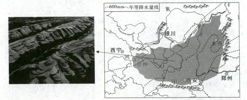 32. 读我国局部地区景观图和该地区年降水量分布图,回答下列问题。(10分)