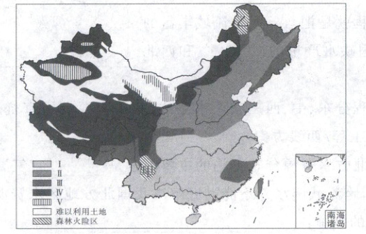 土地是立国之本,我国土地利用类型分布很不均衡。下图为我国主要土地利用类型分布及某日森林火险气象预报示意图。据此完成4-6题。