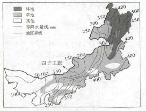 (2021·临沂二模)2020 年 12 月 17 日,“嫦娥五号”圆满完成历时 23 天的探月任务,携带着从月球取回的 1 731 克月壤,在内蒙古四子王旗安全着陆。右图为内蒙古降水量和植被分布图。读图,完成 17—18 题。