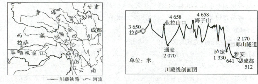 32. (2020·枣庄三模)建设中的川藏铁路连接成都和拉萨,全长 1 639 千米,建成后从成都到拉萨只需 13 个小时。川藏铁路“八起八伏”,累计爬升高度超过 14 万米,外媒戏称其为“一辆巨大的过山车”。结合下图回答下列问题。(13 分)