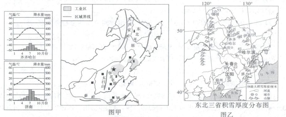 (4)结合图乙,比较延吉和长春积雪厚度的差异,并说明导致这种差异的原因。