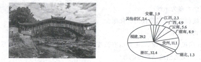 廊桥亦称虹桥、蜈蚣桥等,为有顶盖的桥,有遮阳避雨、供人休憩、交流和聚会等作用。廊桥是能够反映区域地理特征的独特建筑。下左图为中国浙江温州泰顺廊桥,下右图为我国各省廊桥数量占全国总量的比例图。读图,完成 5—6 题。