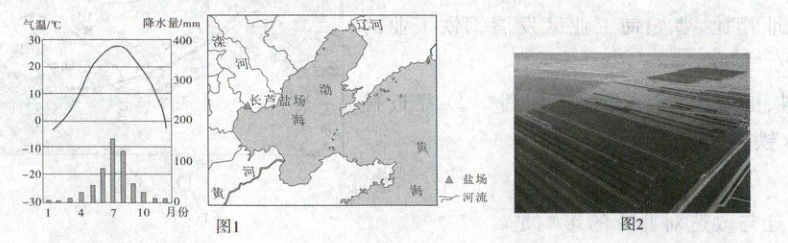 材料三 盐场选址条件:降水量较少、蒸发量较大的气候;广阔、平坦的泥质滩涂;盐度较大,且水质较好的海水。图 1 为长芦盐场气温与降水量图,以及长芦盐场位置图,图 2 为天津“盐光互补”光伏项目实景图。