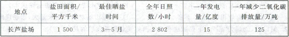 材料二 在我国能源转型大趋势下,天津市大力支持能源绿色低碳转型项目。2023 年 7 月 8 日,位于天津长芦盐场的世界单体最大“盐光互补”项目建成发电。该项目建成后,有望缓解华北地区用电紧张局面。下列为此项目部分资料表。