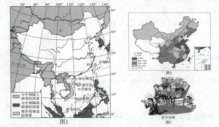13. 某中学打算让学生利用假期观看《航拍中国》节目,一边欣赏祖国的壮美景色,一边验证从地理教材中学习到的地理知识,并整理我国疆域、人口和民族的内容。图 1 为中国疆域示意图,图 2 为中国人口分布图。读图,完成下列问题。