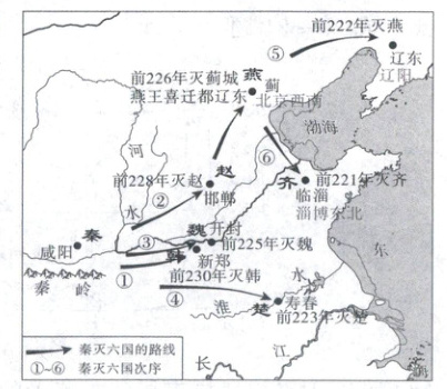 秦灭六国之战,指战国末期,实力最强大的诸侯国秦国消灭其他六个诸侯国,完成统一的战争。右图示意秦灭六国。据此完成 4—5 题。