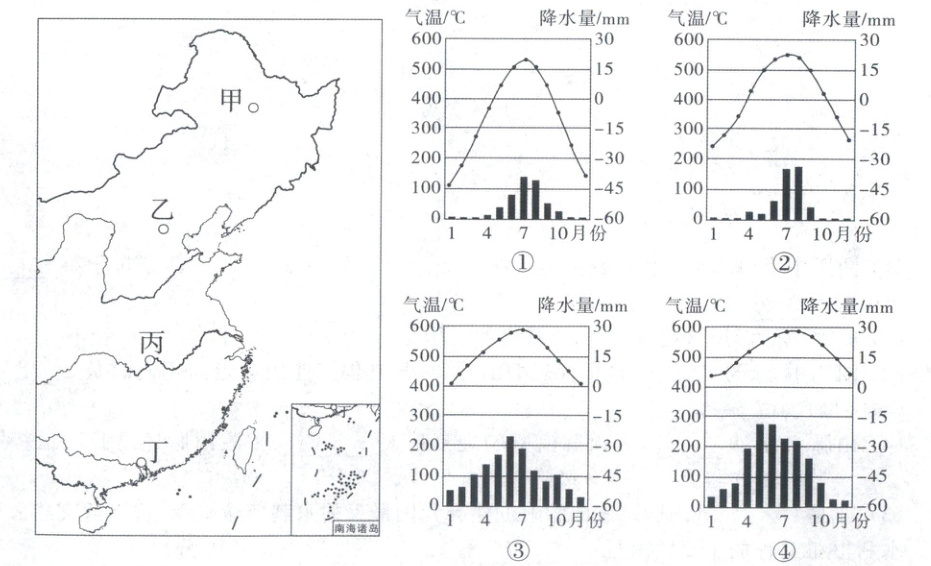 读我国东部地区轮廓图和四地气候统计图,完成 28—30 题。