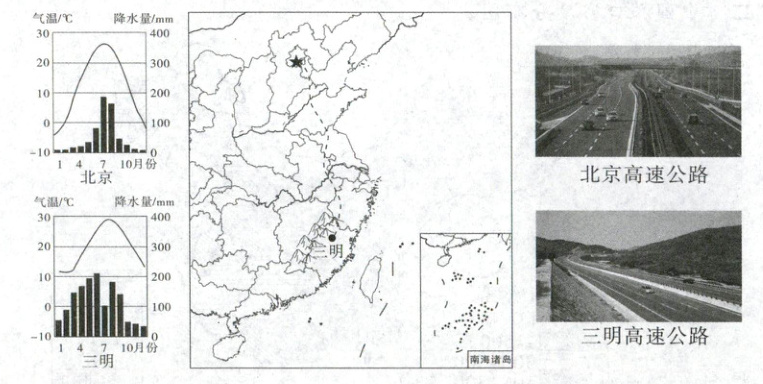 32. 【祖国万里,江山如此多娇】 立春,为二十四节气之首。立,是“开始”之意;春,代表着温暖、生长。立春标志着万物闭藏的冬季已过去,开始进入风和日暖、万物生长的春季。2025年2月3日是立春,家住北京的晓妍于立春期间驱车前往福建省三明市,开始了“一路向南看差异”的魅力中国行。下图为行车路线及两地气候和景观图。读图,完成下列问题。(7分)
