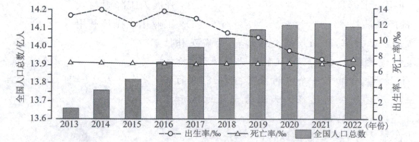2023年2月28日,国家统计局发布2022年国民经济和社会发展统计公报。下图为依据2022年统计公报中的人口数据绘制的全国人口数量及出生率、死亡率(2013—2022年)统计图。据此,完成3—4题。