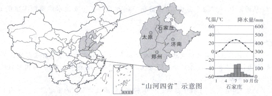 2023年6月,“山河四省”伴随着“山河大学”突然蹿红,成为网络新词组。读“山河四省”位置示意图及石家庄气候资料图,完成24—25题。