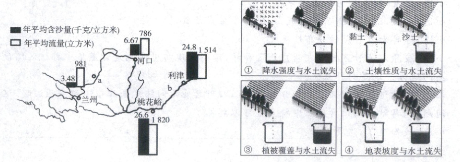 31. 某中学地理研学小组以“黄河宁,天下平”为主题,开展系列研学活动。请你根据研学小组收集的资料,协助他们完成知识框架图。下面左图为黄河干流泥沙沿途的变化图,下面右图为研学小组对比实验图。(12分)