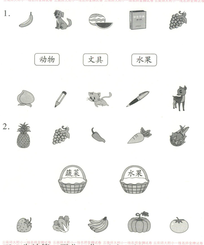 1. 动物:小狗、小猫、小鹿;文具:学生字典、铅笔、钢笔;水果:香蕉、西瓜、葡萄、桃子。