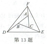 13. 如图,点 A,B,C 分别是线段 CF,AD,BE 的中点,且△ABC 的面积为$ 3 cm^2,$则△DEF 的面积为