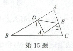 15. 如图,将三角形纸片 ABC 沿 DE 折叠,点 A 落在点$ A_1 $处.已知∠1 + ∠2 = 100°,则∠A =