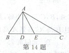 14. 如图,在△ABC 中,已知∠B = 60°,∠C = 40°,AD ⊥ BC 于点 D,AE 平分∠BAC,则∠DAE =