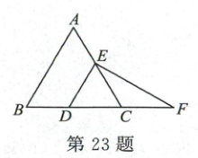 23. (14 分)如图,在等边三角形 $ ABC $ 中,点 $ D $,$ E $ 分别在边 $ BC $,$ AC $ 上,且 $ DE // AB $,过点 $ E $ 作 $ EF \perp DE $,交 $ BC $ 的延长线于点 $ F $.