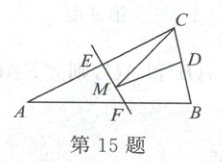 15. 如图,等腰△ABC 的底边 BC 长为 6,面积是 18,腰 AC 的垂直平分线 EF 分别交 AC,AB 边于 E,F 点.若点 D 为 BC 边的中点,点 M 为线段 EF 上一动点,则△CDM 周长的最小值为