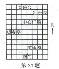 20. (10 分)春天到了,七(1)班组织同学到人民公园春游,张明、李华对着景区示意图(如图)描述牡丹园的位置(图中小正方形的边长为 $ 100\ m $).