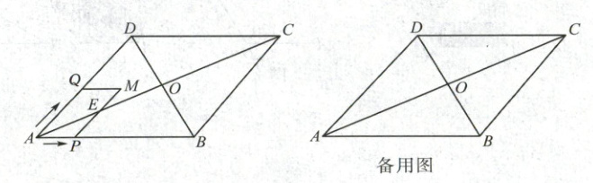 23. (14 分)如图,在菱形 $ ABCD $ 中,对角线 $ AC $,$ AB = 10 $ cm,$ BD = 4\sqrt{5} $,点 $ P $ 沿 $ AB $ 方向匀速运动,速度为 1 cm/s,动点 $ Q $ 从点 $ A $ 出发,沿 $ AD $ 方向匀速运动,以 $ AP $,$ AQ $ 为邻边的平行四边形 $ APMQ $ 的边 $ PM $ 与 $ AC $ 交于点 $ E $.设运动时间为 $ t $(单位:s)($ 0 < t \leq 5 $),解答下列问题: