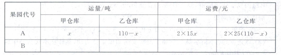|A|甲仓库 $ x $,乙仓库 $ 110 - x $|甲仓库 $ 2 × 15x $,乙仓库 $ 2 × 25(110 - x) $|