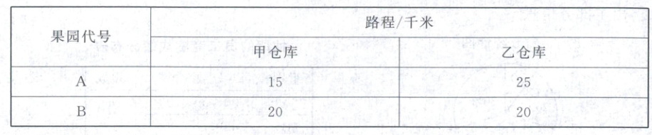 20. (6分)为保护环境,提高果树产量,某果农计划从甲、乙两个仓库向A,B两个果园运送有机化肥.甲、乙两个仓库分别可运出80吨和100吨有机化肥,A,B两个果园分别需要110吨和70吨有机化肥,两个仓库到A,B两个果园的路程如下表所示.