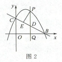 (3)如图 2,当点 $ P $ 位于直线 $ BC $ 上方的抛物线上时,过点 $ P $ 作 $ PE \perp BC $ 于点 $ E $,当 $ PE $ 取得最大值时,求点 $ P $ 的坐标,并求出 $ PE $ 的最大值.