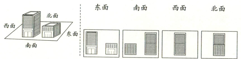 1. 认真观察,下面的图形各是从哪个方向看到的?连一连。(8 分)
