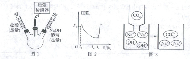 8. 在三颈烧瓶中用排空气集气法收集二氧化碳气体,然后将三颈烧瓶与盛有盐酸、氢氧化钠溶液的注射器和压强传感器密封连接(如图1所示)。在$t_{1}$时快速注入一种溶液,$t_{3}$时快速注入第二种溶液,测得瓶内压强随时间的变化曲线如图2所示。下列说法错误的是(