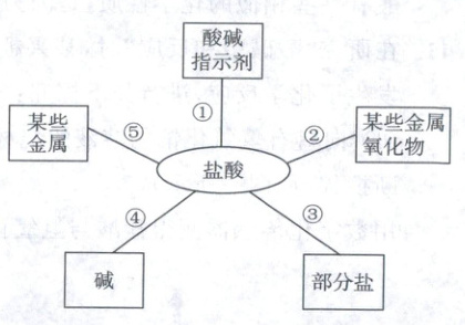 9. 小海用如图所示的思维导图总结了稀盐酸的五条化学性质,分析右图并回答问题。
